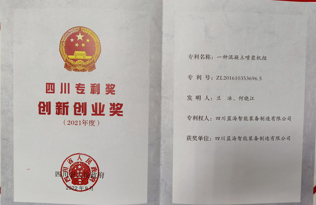 近日,四川省公布2021年度“四川專利獎”獲獎單位名單,四川藍(lán)海智能裝備制造公司發(fā)明專利“一種混凝土噴漿機(jī)組”榮獲“四川專利獎—創(chuàng)新創(chuàng)業(yè)獎”。