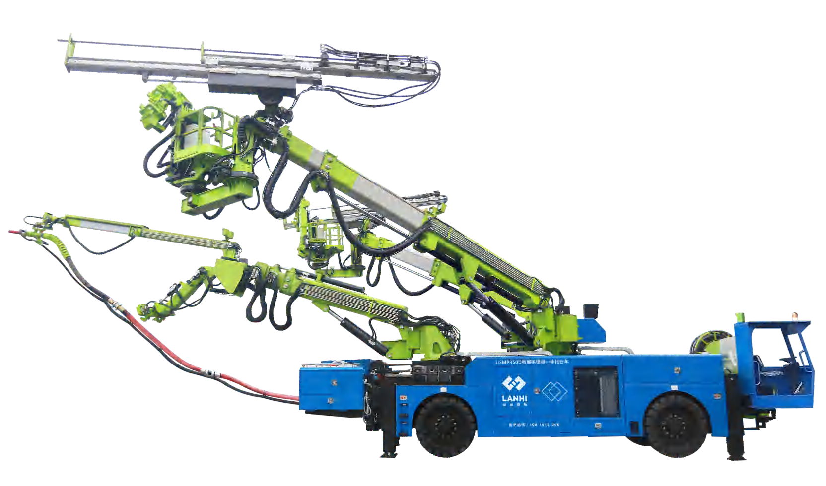 LGMP350D智能拱錨噴一體化臺車是藍(lán)海智裝和四川路橋隧道分公司聯(lián)合研發(fā)的一款隧道初支作業(yè)一體化臺車,該設(shè)備采用工程底盤、四輪驅(qū)動、四輪轉(zhuǎn)向、前后雙向駕駛結(jié)構(gòu),上裝采用三臂全滑移、三抓手、兩吊籃、兩欠挖錘、兩錨桿臂結(jié)構(gòu)。設(shè)備無需退場即可兼?zhèn)渌淼莱踔д麄€工序,洞內(nèi)施工工序無縫連接,大大提高施工效率,減少施工隱患和職業(yè)傷害。