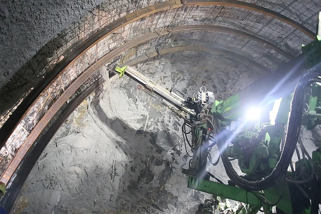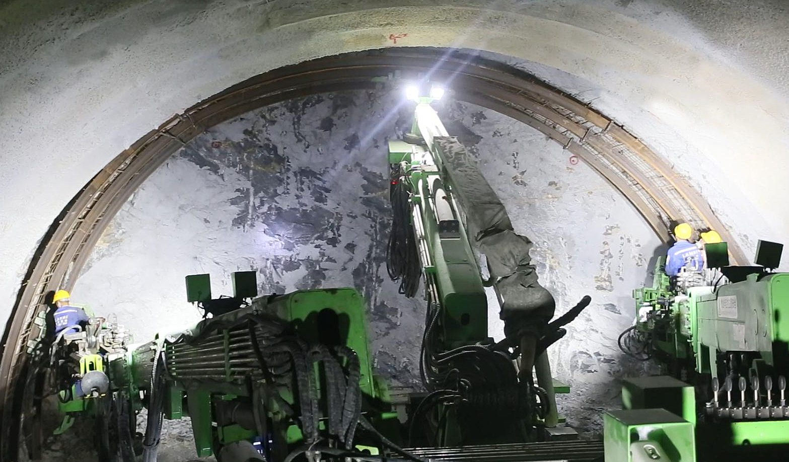 將多榀折疊拱架通過裝載機轉(zhuǎn)運到施工面,智能拱錨一體化臺車隨后進洞準備施工,中間臂架抓取拱架并舉升到一定高度,通過右側(cè)臂架逐步展開右端拱架,左側(cè)臂架隨后展開左側(cè)段拱架,在已初支好的拱架下鏈接螺栓,保證了施工人員的安全,三臂協(xié)助將展開成型的多榀折疊拱架調(diào)整定位并固定,多榀折疊拱架安裝到位后將剩余網(wǎng)片連接筋焊接好,采用多榀預(yù)制折疊拱架安裝方式,減少了洞內(nèi)作業(yè)時間,大大提高了施工人員的安全,拱架安裝完成,安裝設(shè)計要求進行左右鎖腳錨桿,拱腰、拱頂系統(tǒng)錨桿、超前小導(dǎo)管等鉆孔作業(yè)。