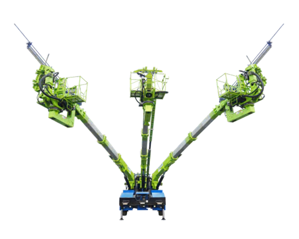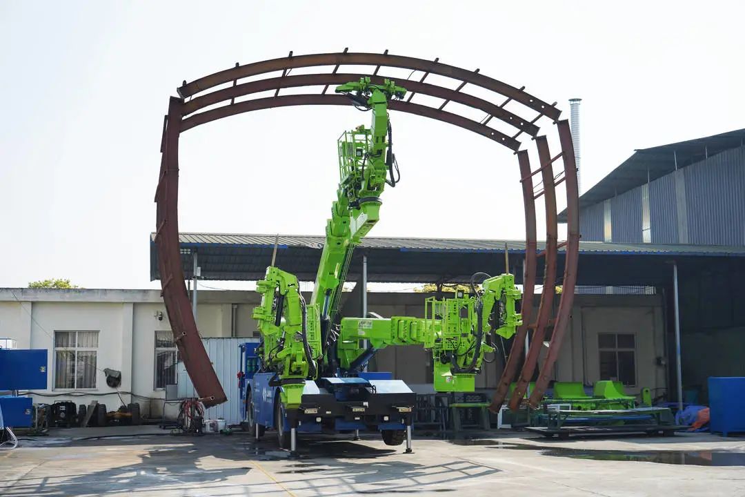 用裝載機將預(yù)制好的拱架轉(zhuǎn)運到掌子面,拱架臺車隨后進場施工,撐起支腿,遙控器操作展開臂架,中間臂架夾取中段拱架并舉升至安裝位置,左右兩側(cè)臂架分別同時夾取拱架并舉升至安裝位置,通過臂架調(diào)整,使拱架連接對位,對位完成后,吊籃人員使用電動扳手緊固螺栓,通過臂架調(diào)整拱腳安裝位置,拱架調(diào)整定位完成后,煤接剩余的連接筋及網(wǎng)片,采用藍海智裝自主研發(fā)的創(chuàng)新型多榻預(yù)制拱架安裝專利技術(shù),實現(xiàn)多標預(yù)制拱架洞外標準化預(yù)制,提高拱架質(zhì)量和初支強度,滿足全斷面、三臺階三合階及帶核心土等多種施工方式,施工人員處于拱架網(wǎng)片和連接筋雙重保護下,安全性大幅提升,該設(shè)備中間臂架舉升力為3噸,后期也可制作折疊拱架施工,進一步提高效率和安全性,焊接完成后,左右兩臂架同時進行錨桿作業(yè)。按照設(shè)計要求,進行左右鎖腳錨桿、拱腰、拱頂系統(tǒng)錨桿,超前小導(dǎo)管等鉆孔作業(yè)。錨桿作業(yè)完成后,收回臂架,設(shè)備離場。