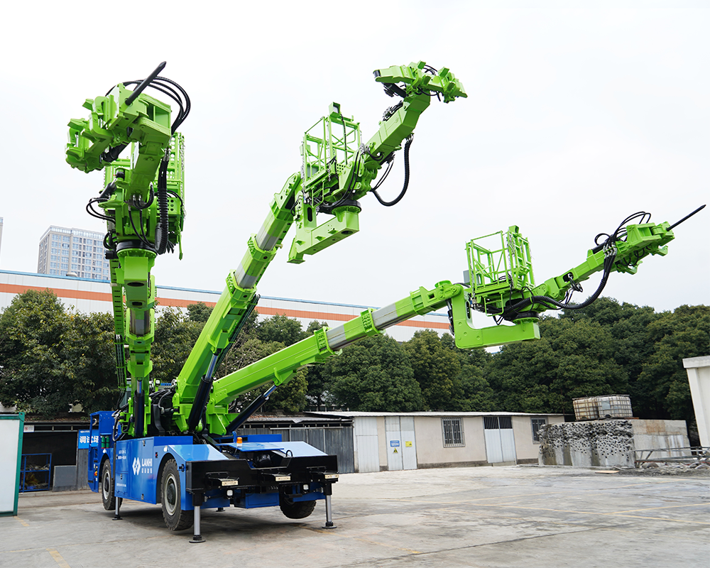 LG312B 智能拱架一體化臺(tái)車多項(xiàng)工序集成于一體,包含測量放點(diǎn)、欠挖作業(yè)、拱架安裝、焊接網(wǎng)片及連接 筋等。臺(tái)車采用工程底盤,柴、電雙動(dòng)力系統(tǒng),具備四輪轉(zhuǎn)向、四輪驅(qū)動(dòng)、雙向駕駛等功能。三臂架采用滑 移結(jié)構(gòu),具備無線遙控控制,滿足預(yù)制拱架安裝、各種臺(tái)階法作業(yè)及拱架精準(zhǔn)定位調(diào)整,在降低人力成本, 降低施工風(fēng)險(xiǎn),提高效率的同時(shí),實(shí)現(xiàn)隧道立拱的標(biāo)準(zhǔn)化和工廠化。