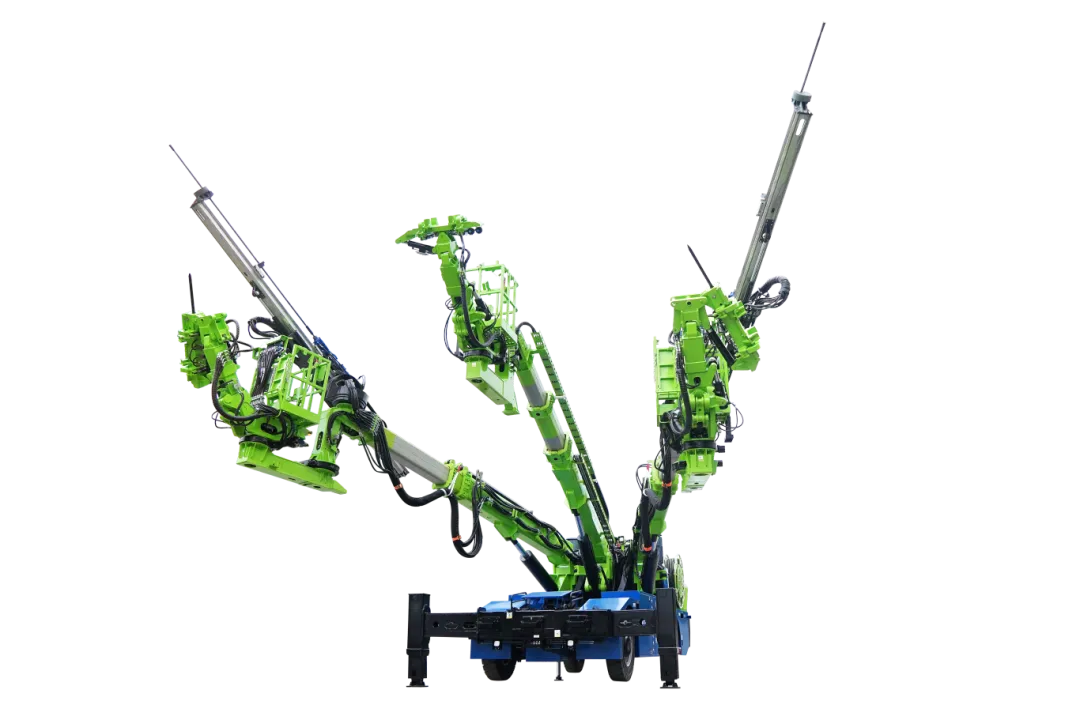 集測(cè)量放點(diǎn)、欠挖作業(yè)、拱架安裝、錨網(wǎng)安裝、超前支護(hù)、系統(tǒng)錨桿施工、錨桿注漿(選配)等功能一體;三臂三抓手三吊籃,中臂最大舉升為3噸,遙控操作,結(jié)合多榀預(yù)制和折疊拱架安裝,立架1小時(shí)左右可以完成;最大鉆孔深度可達(dá)4.6米,左右臂架可同時(shí)進(jìn)行鎖腳、系統(tǒng)錨桿和超前錨桿作業(yè)。